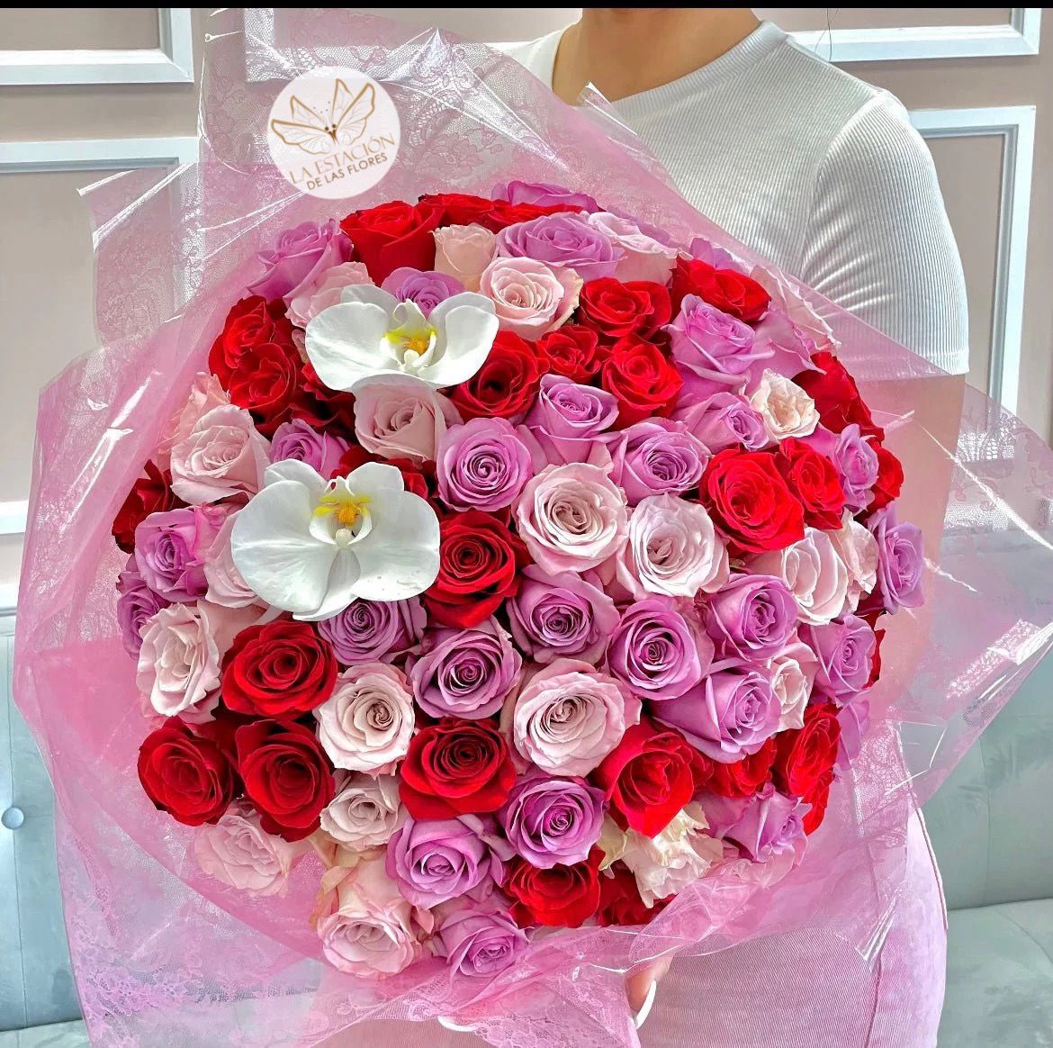 Cada rosa, seleccionada a mano por nuestros expertos floristas, es un símbolo de amor y belleza. La variedad de tonos y texturas añade profundidad y dimensión al arreglo, convirtiéndolo en una obra de arte floral única. Las sofisticadas orquídeas blancas, con su elegancia atemporal, aportan un toque de sofisticación y contraste.